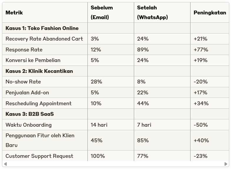 Untuk memberikan gambaran lebih konkret tentang keunggulan WhatsApp marketing, berikut beberapa studi kasus dari bisnis yang telah saya dampingi: