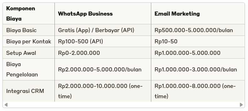 Tabel Biaya Penggunaan WhatsApp Business vs Email Marketing