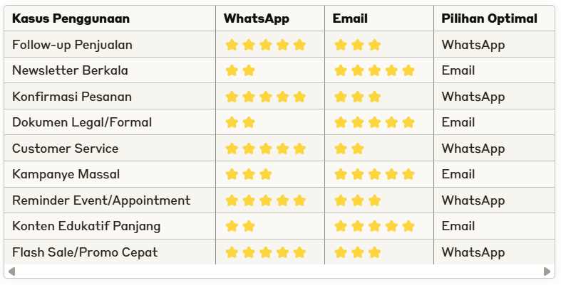 Tabel Kasus Penggunaan Optimal untuk WhatsApp vs Email