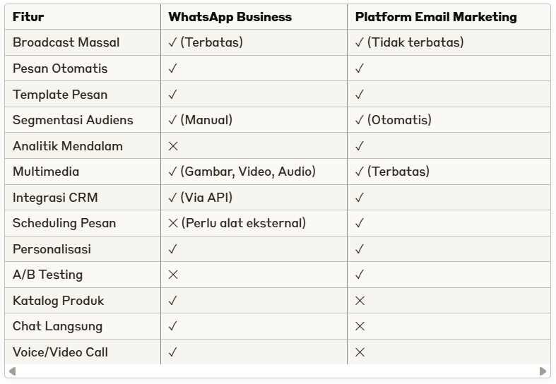Tabel Perbandingan Fitur WhatsApp Business vs Platform Email Marketing